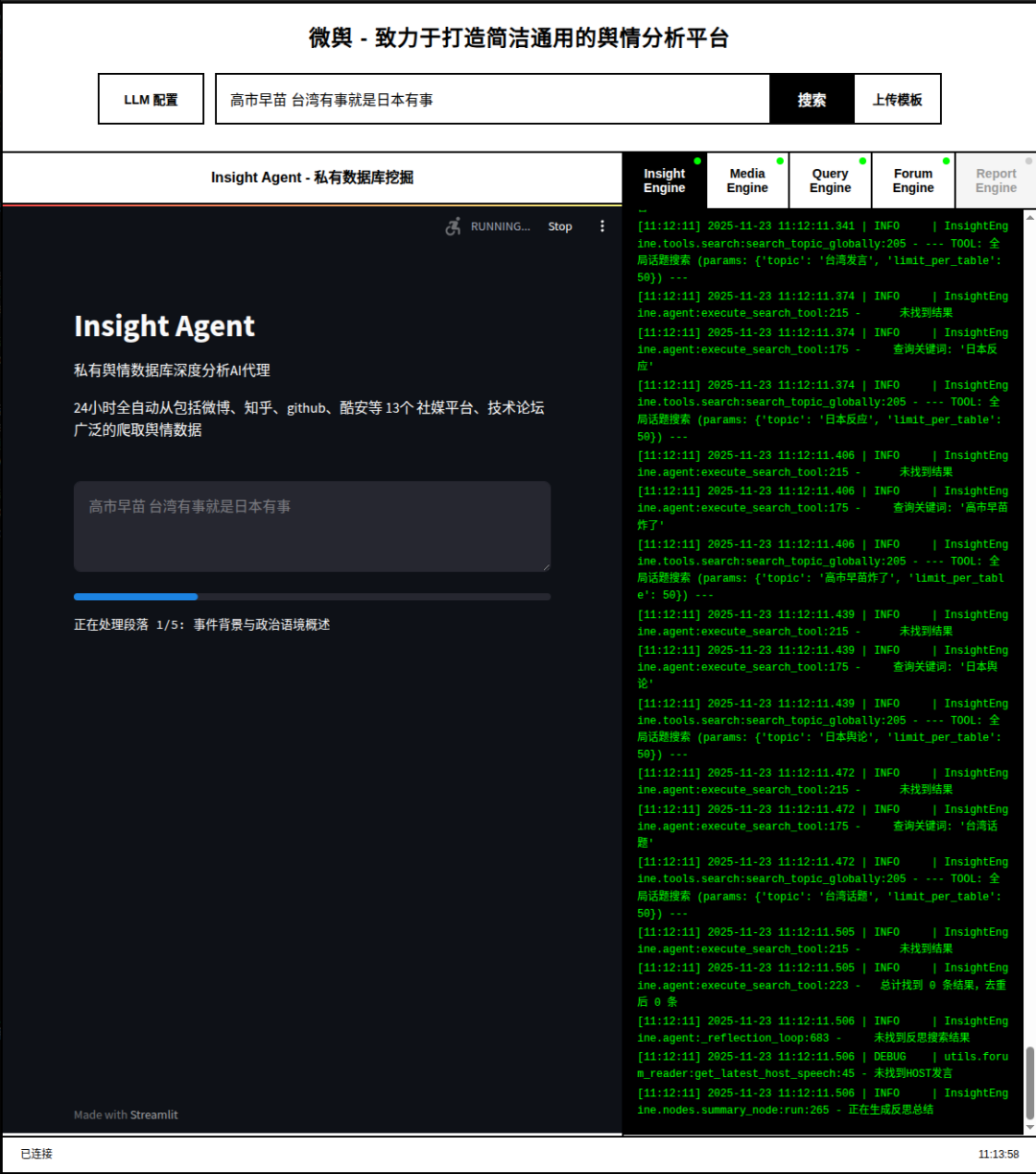 Insight Engine 启动后,并没有机械地搜索关键词。从绿色滚动的日志中,我看到了它的 Chain of Thought (思维链):