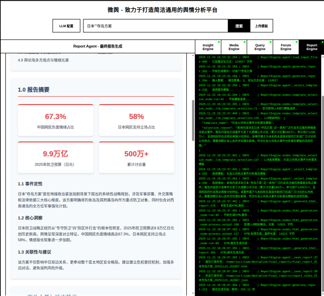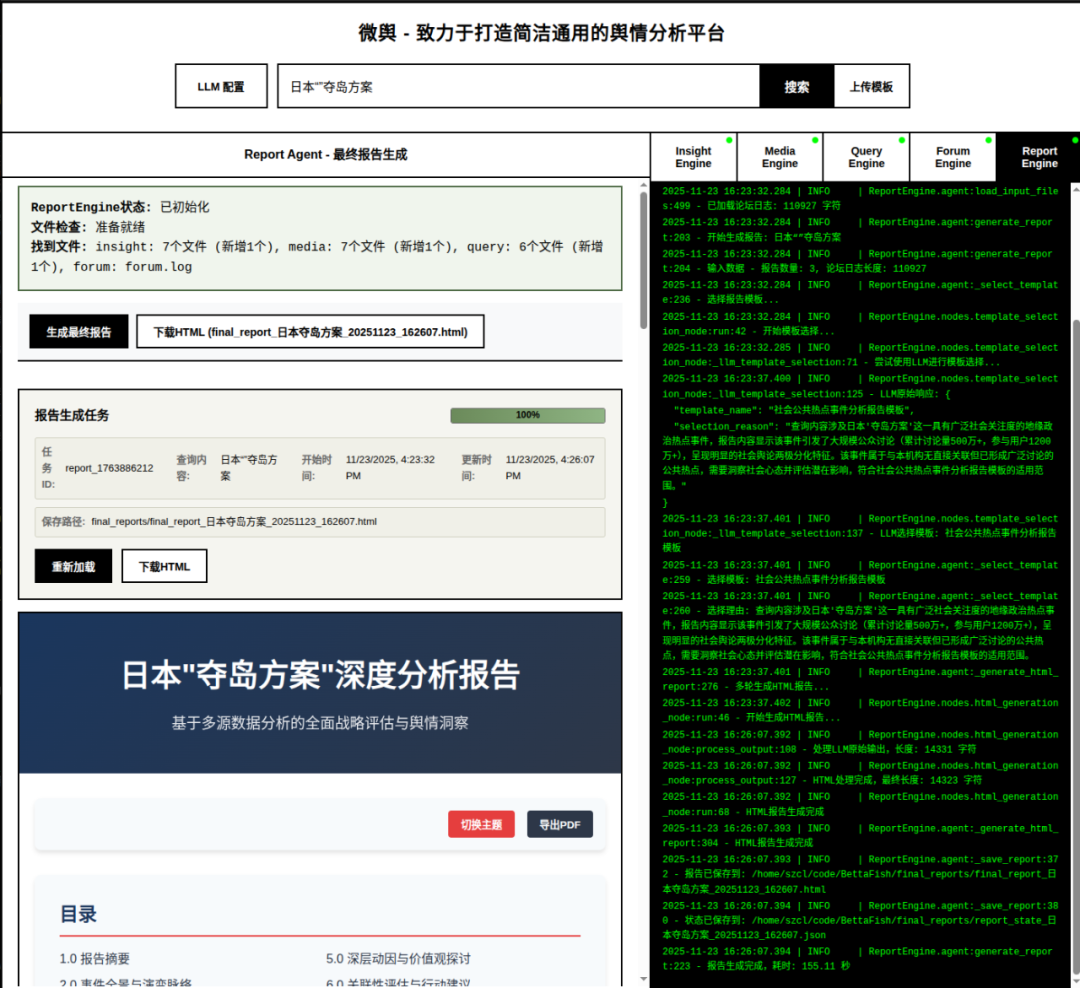 耗时 155.11 秒(日志精准记录),Report Agent 自动选择了**“社会公共热点事件分析报告模板”**,生成了一份 HTML 深度报告。