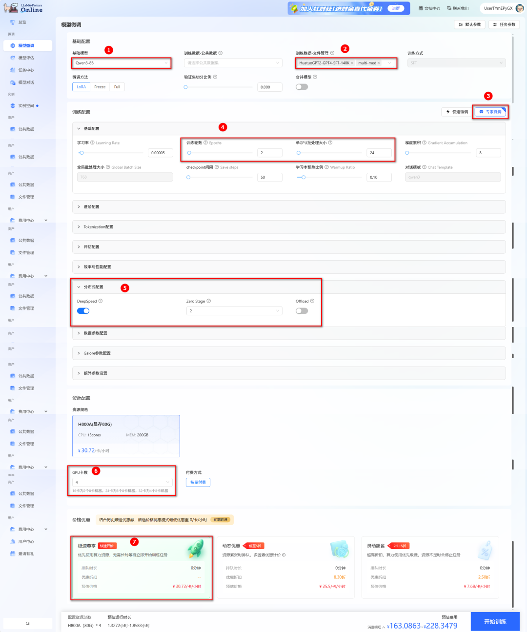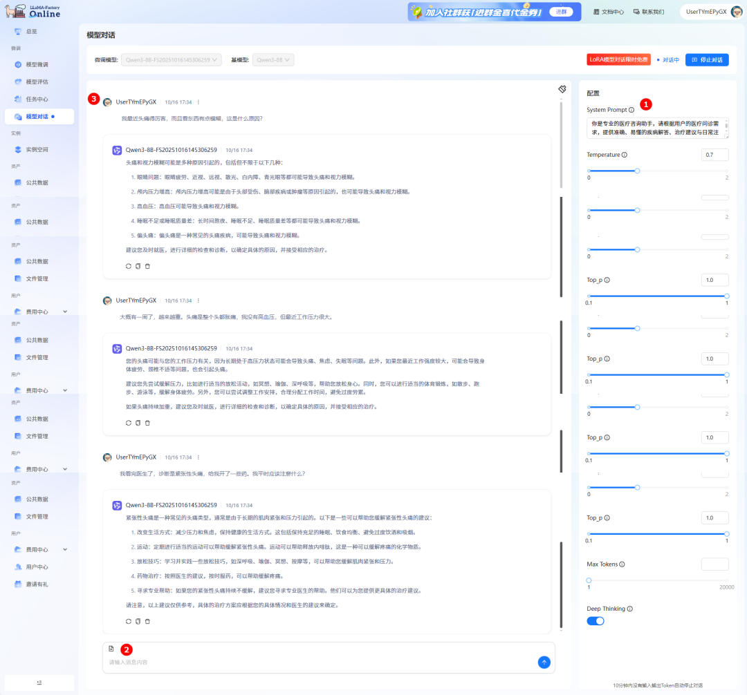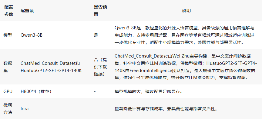 本实践使用平台内置的Qwen3-8B作为基础模型(如图①),数据集为ChatMed_Consult_Dataset(multi-med)和HuatuoGPT2-SFT-GPT4-140K(如图②)。