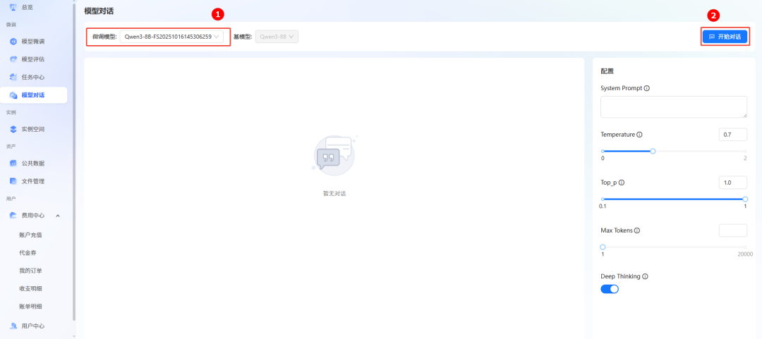 1.单击页面左侧导航栏“模型对话”,进入模型对话页面。