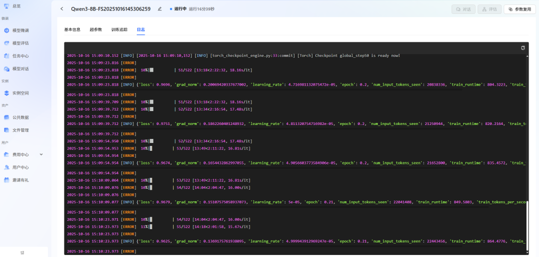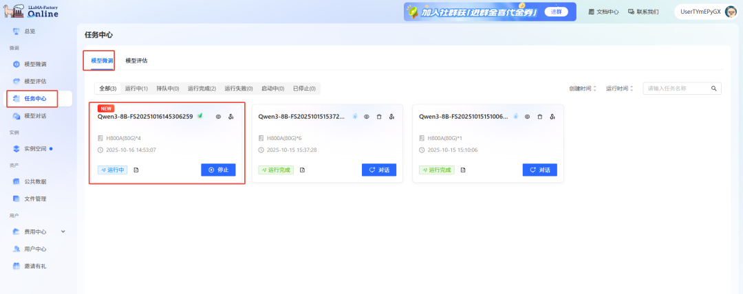- 通过任务中心查看任务状态。 在左侧边栏选择“任务中心”,在“模型微调”页面即可看到刚刚提交的任务。
