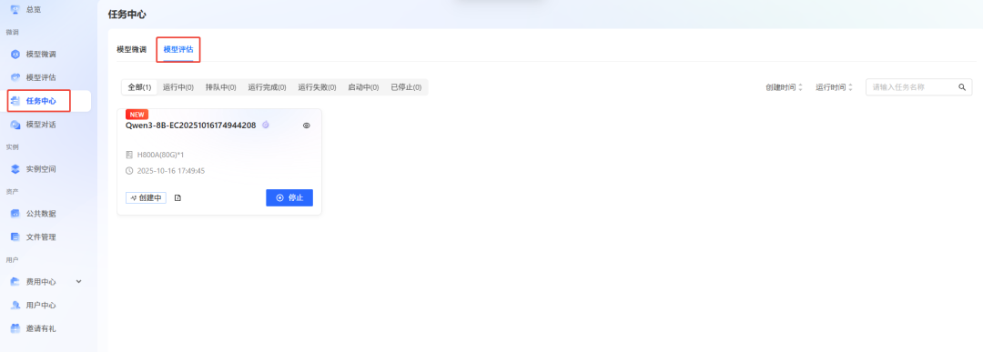- 可以在“任务中心->模型评估”下看到评估任务的运行状态。