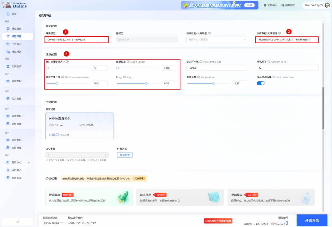 微调模型选择上一步骤微调后的模型(如图①),评估数据集为ChatMed_Consult_Dataset(multi-med)和HuatuoGPT2-SFT-GPT4-140K(如图②)。然后配置如下参数(如图③):