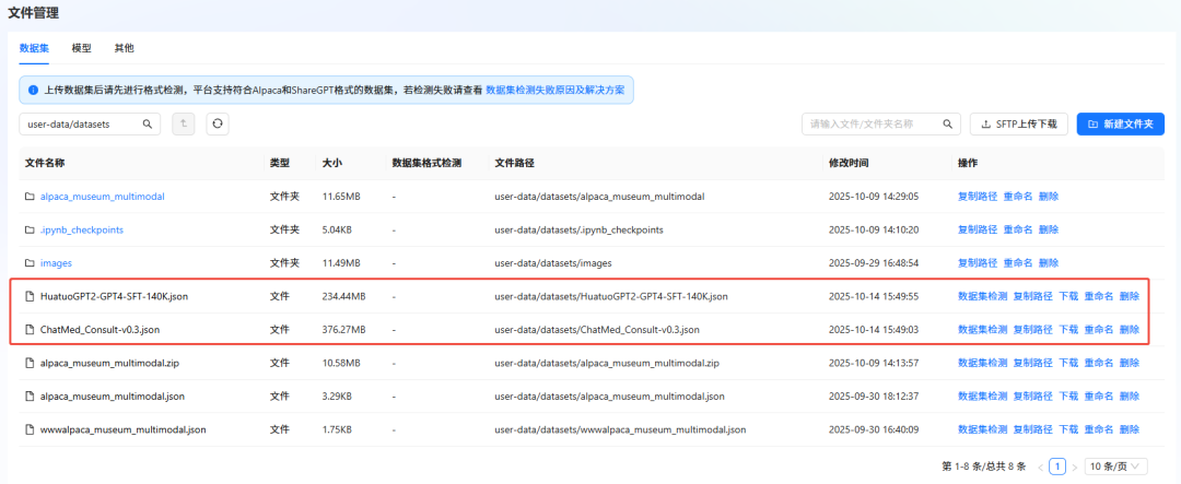 回显信息如图③所示,说明数据格式转换成功,且转换后的数据存放在/datasets/multi-med.json中,即原数据集文件ChatMed_Consult_Dataset经格式转换后生成新的数据集文件multi-med。