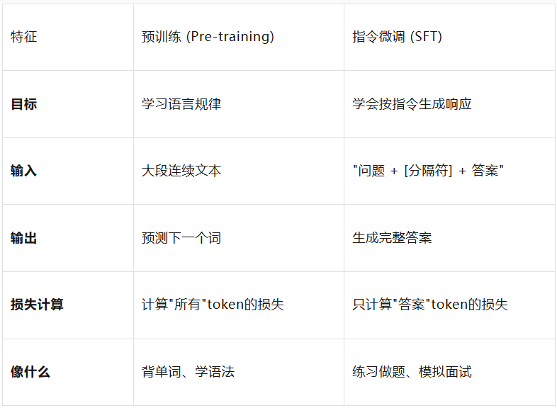 - 指令微调 (SFT): 考的是"问答题"。题目是:“描述计算机主板的功能?”,你希望模型写出:“计算机主板是计算机中的主要电路板,是系统的支撑。” 模型的任务是:“看到问题,生成一个完美的答案”。而且,在计算损失时,“只看答案部分是否正确”,问题部分的预测误差会被忽略。