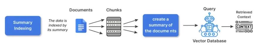 摘要索引允许你在嵌入之前,将资料片段重构成更小的摘要。你将完整的原始内容保留在另一个位置,然后在摘要版本上执行检索。