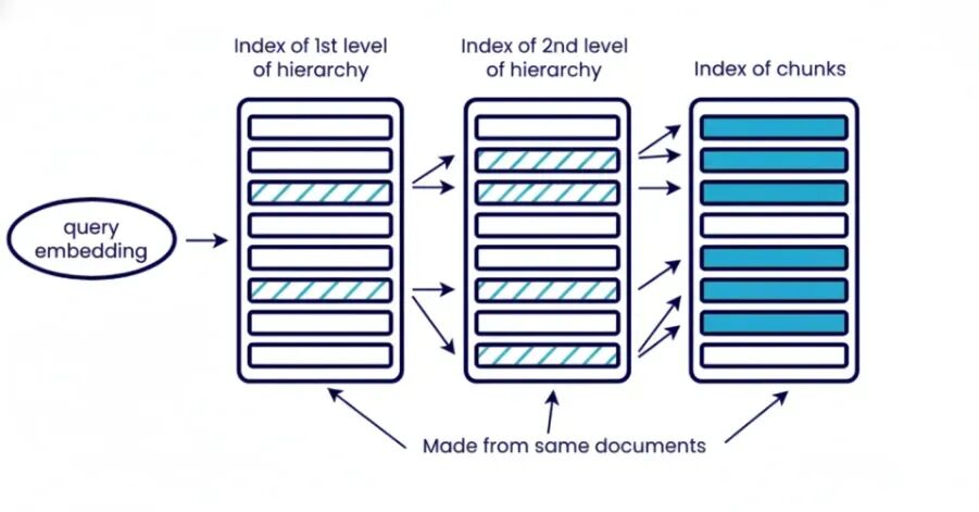 分层索引将信息组织成多个不同级别:文档、章节、段落、子段落。你分阶段进行检索,从广泛的介绍开始,逐步缩小到特定的上下文。顶层组件检索相关文档的章节,下一层检索在这些检索到的文档章节内的特定上下文的段落或子段落。