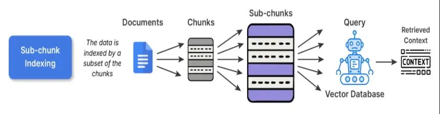 子块索引是在块索引基础上进行精炼的一层。在嵌入正常知识块时,你会将知识块进一步划分成更小的子块。在进行检索时,你将子块与查询进行比较,一旦子块匹配你的查询,完整的父块就会作为输入传递给 LLM。