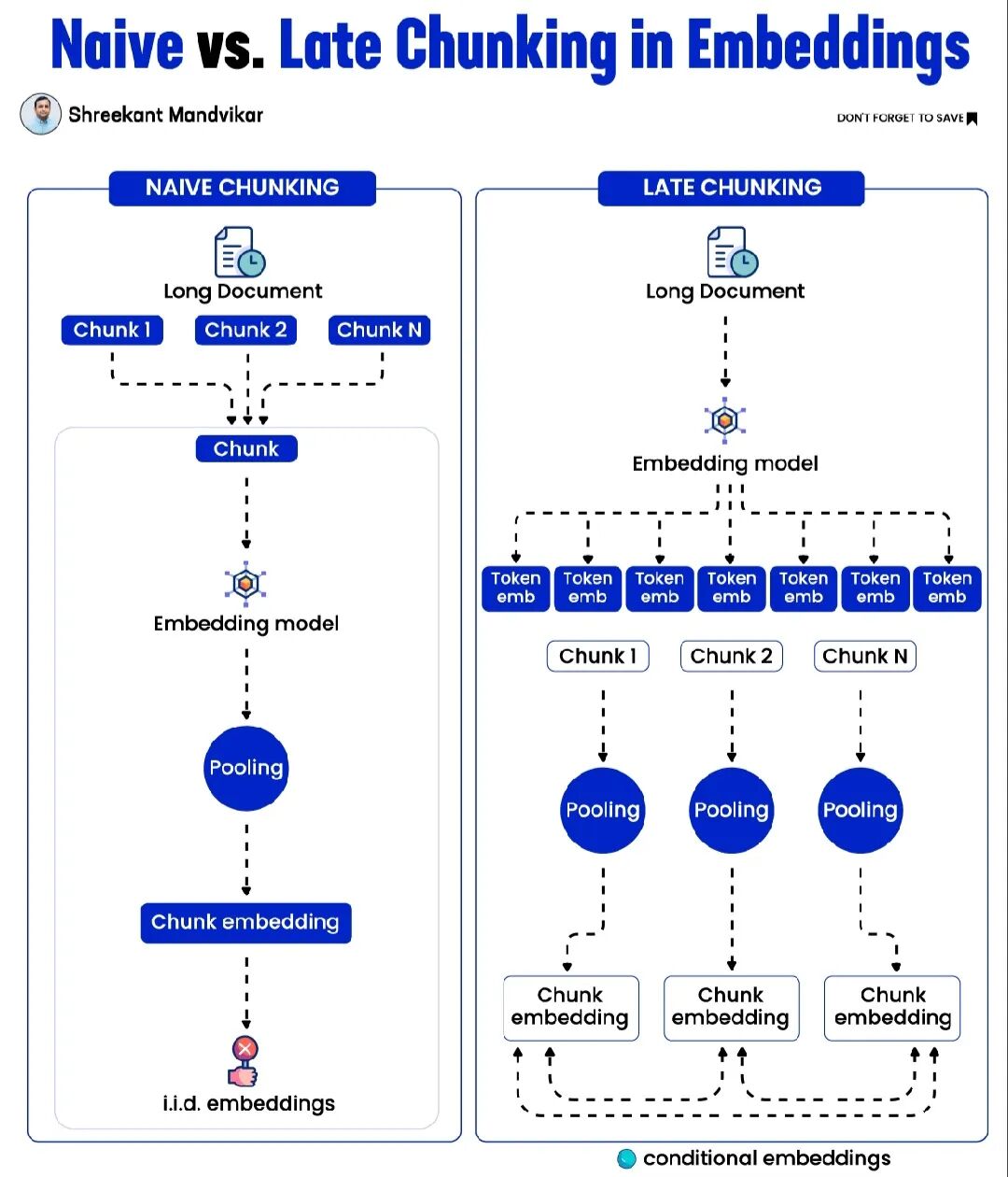 接下来将探讨两种截然不同的分块范式:传统的朴素分块(Naive Chunking)与革新性的后期分块(Late Chunking),揭示它们在处理长文本上下文时的本质差异。