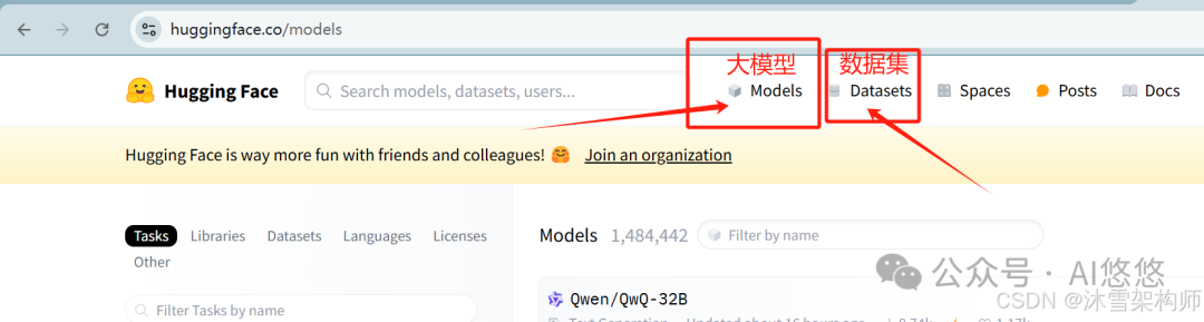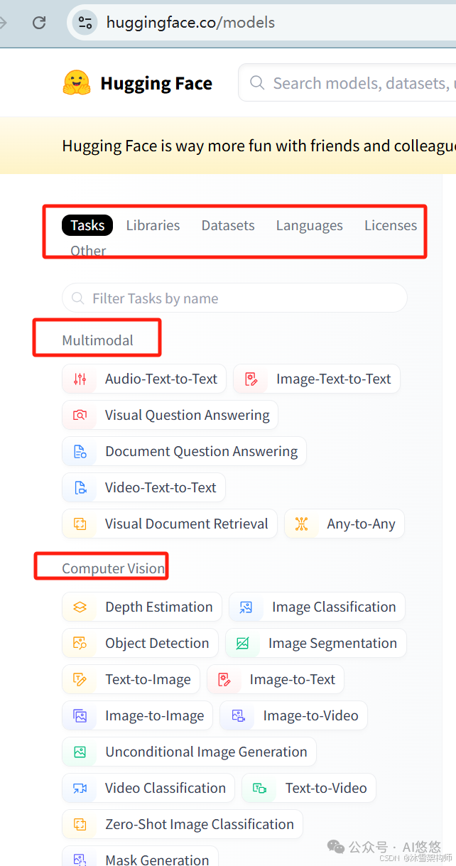 点击“Models”,左侧有分类。主导航有根据“任务Tasks”,“库Libraries”,“数据集DataSets”,“语言Languages”,"开源协议Licenses"等。