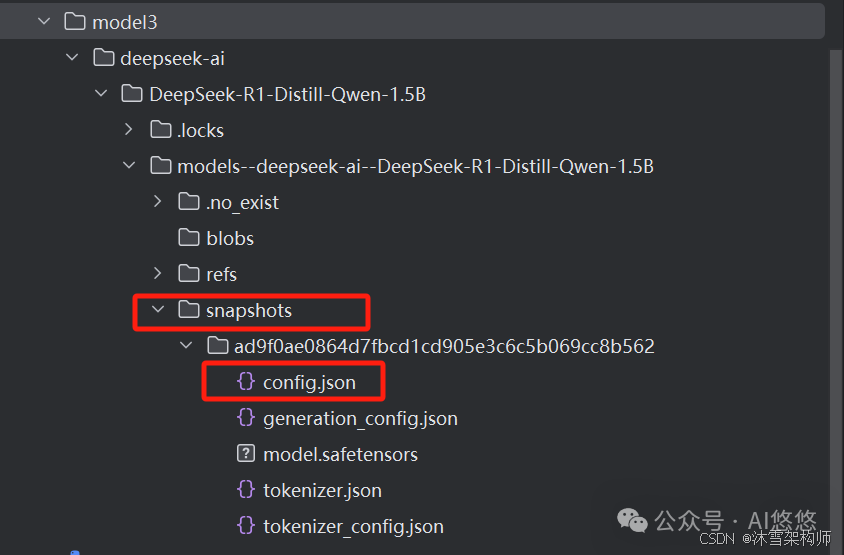 模型的核心内容主要是看 snapshots-config.json所在的目录,也是模型的默认目录地址。model.safetensors就是模型的源文件,