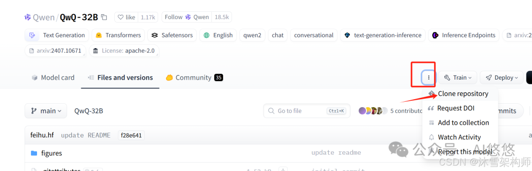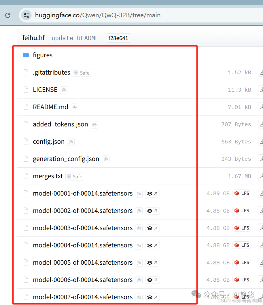 打开千问最新版本 Qwen/QwQ-32B,在"Files and Versions"模型文件页面下,可以看到很多类似”model-00001-of-00014.safetensors“ ,后缀 safetensors就是模型文件的名称。