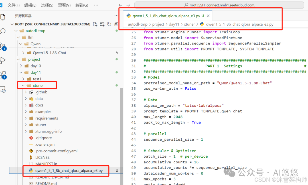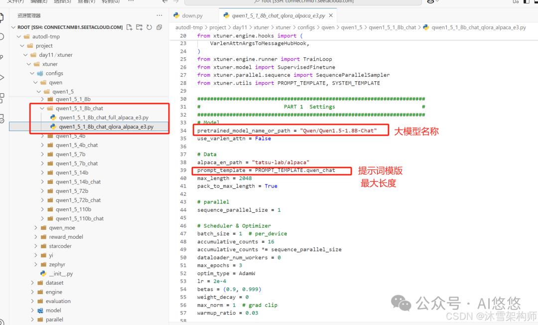 一般我们会保留XTuner的原始配置文件,将配置文件复制一份放其根目录下。比如将xtuner/xtuner/configs/qwen/qwen1_5/qwen1_5_1_8b_chat/qwen1_5_1_8b_chat_qlora_alpaca_e3.py复制到xtuner根目录。