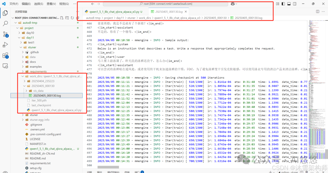 执行微调训练指令成功后,将 xtuner/work_dirs/ 目录下看到执行的内容。