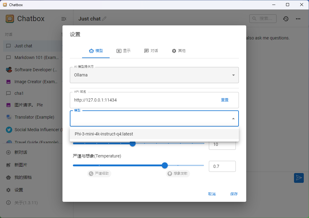 4.安装完成大模型后,可以使用Chatbox调用Ollama进行大模型推理,可以提问等一系列操作。