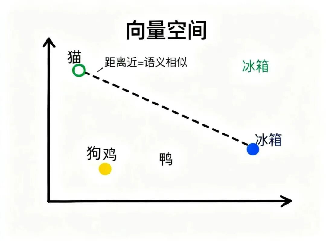 - 而"猫"和"冰箱"几乎没什么关联,所以它们的坐标自然就离得很远。