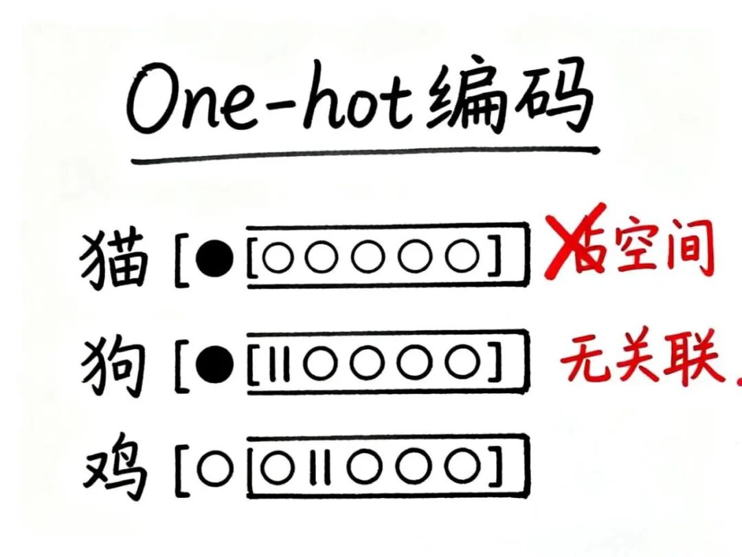 第二个问题更要命——完全看不出词语之间的关系。猫和狗都是宠物,鸡和鸭都是家禽,人类一眼就能看出它们的相似性。但在One-hot编码的眼里,它们只是毫无关联的编号,就像身份证号一样,彼此之间没有任何意义上的联系.
