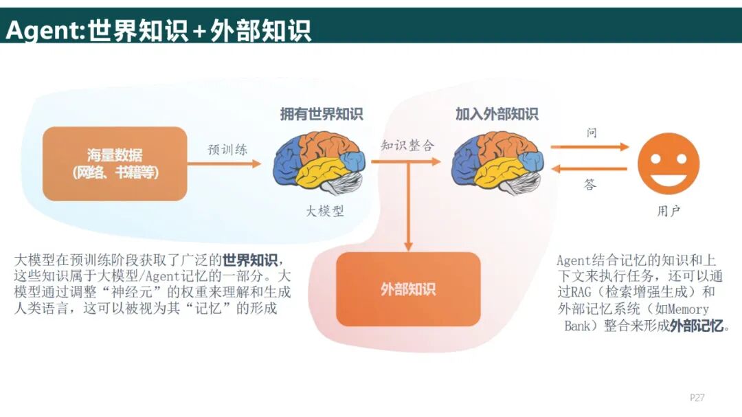 工具层和存储层:工具层集成了API(比如天气和支付接口),代码解释器,记忆存储用RAG 构建外部知识库(解决幻觉问题),而长期记忆可以与Pinecone等向量数据库对接。