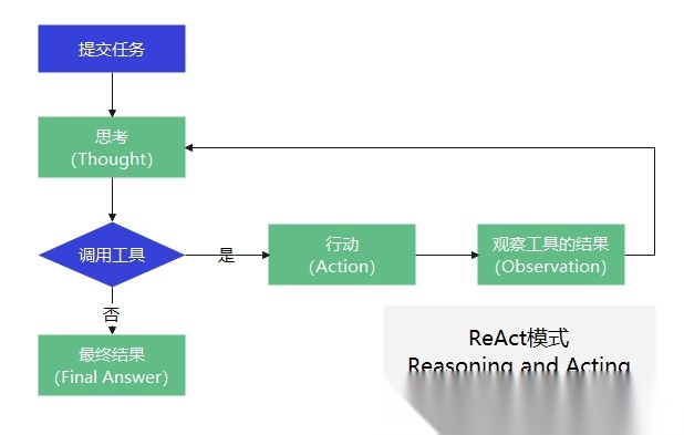 在ReAct模式下,用户先提交任务,Agent先做思考(Thought);思考后会决定是否调用工具,如果需要就会调用对应的工具,ReAct称这一步为行动(Action);在行动后Agent会去查看工具的执行结果,比如读取文件内容、写入文件是否成功等,ReAct称这一步为观察(Observation);在观察之后,ReAct会继续思考,它会再次判断是否需要调用工具,如果还是需要的话,它会继续重复之前所说的行动、观察、思考的流程,直到某一个时刻,可以给出结论了,此时它就输出了最终答案,整个流程如下:
