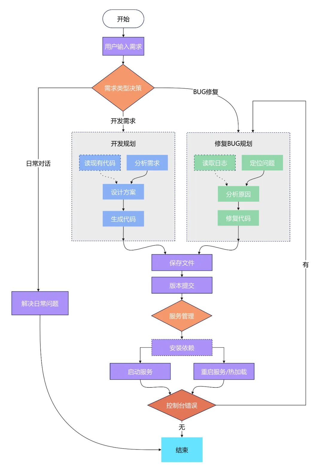 从下一期开始,我会以一个“代码生成系统”为实例,详细讲解Agent如何在实际项目中进行运用,整个“代码生成系统”的业务流程大致如下: