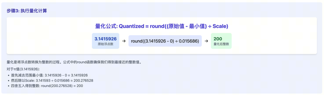 - 计算量化后的值:3.1415926 ÷ 0.0157 ≈ 200;