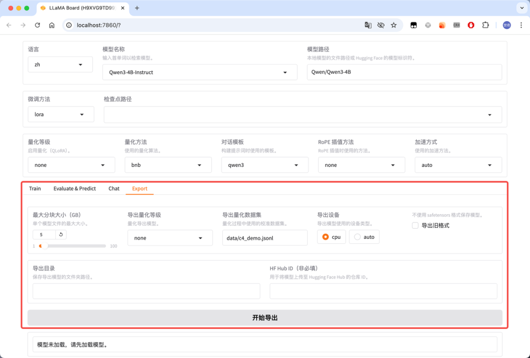- 模型导出:可以指定模型、适配器、分块大小、导出量化等级及校准数据集、导出设备、导出目录等。