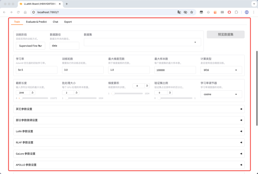 - **RLHF 参数:**当训练阶段为强化学习时需要配置的一些特殊参数;