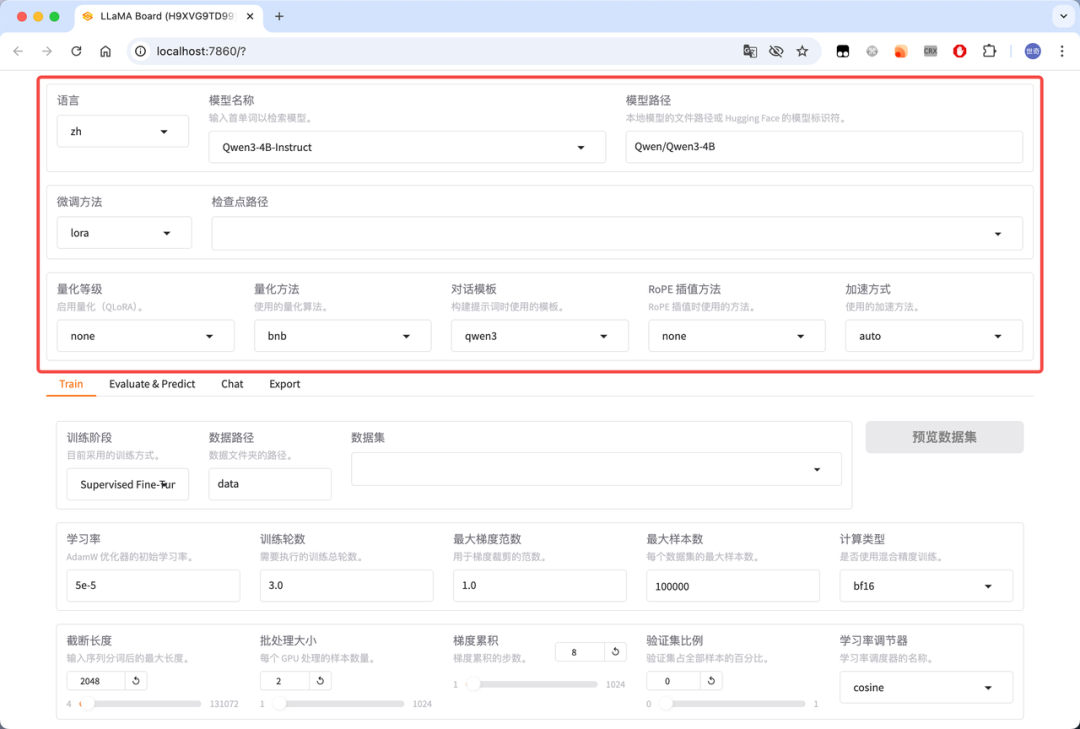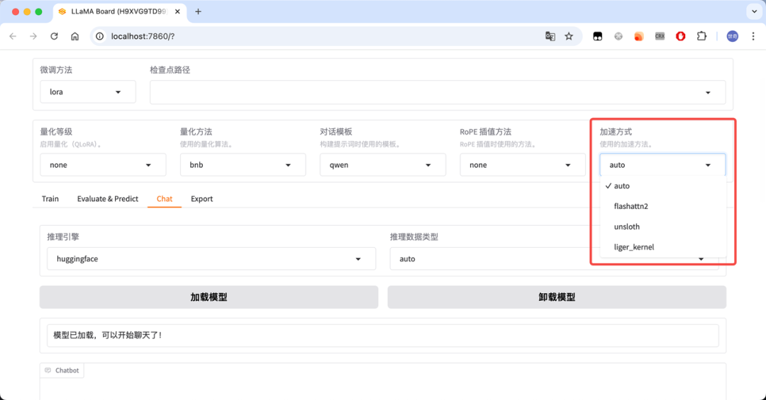 另外两种加速方式,大家做简单了解即可,如果你对微调性能没有过多要求,可以选择默认(默认会使用 Flash Attention 加速),如果本地硬件条件非常受限,可以选择启用 Unsloth + 4 位量化。