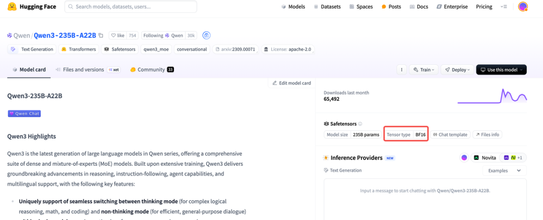 为了表示这些参数,我们需要在计算机上开辟一些内存空间,开辟多大的内存空间就取决于这些参数存储的精度。如果参数的精度越低,所需的内存空间就越小,反之参数精度越高,所需内存空间就越大。比如我们把原本存储了 7 位小数的一个参数:3.1415926,转换成一个精度更低的值:3.14 来进行存储,很明显我们丢掉的精度仅仅为 0.0015926 ,但是我们却大大节省了存储空间,模型量化的本质其实就是把模型的参数从高精度转换成低精度的过程。我们在 Hugging Face 上可以看到模型参数的存储精度,比如 Qwen3-235B 的参数使用的是 BF16: