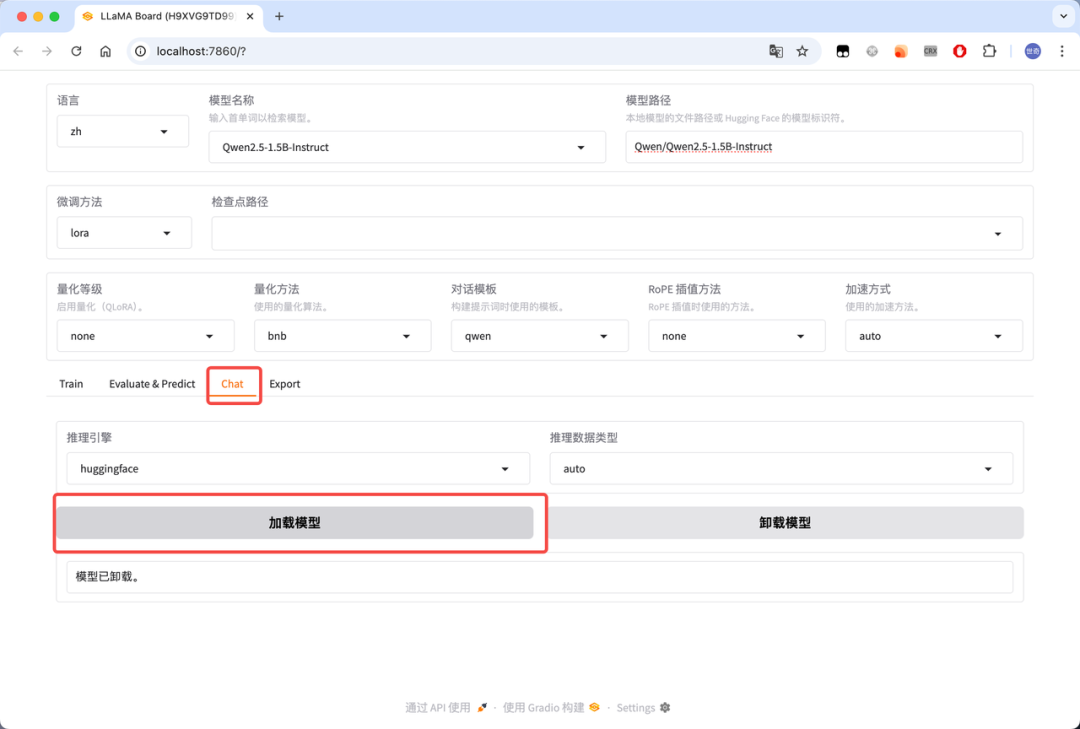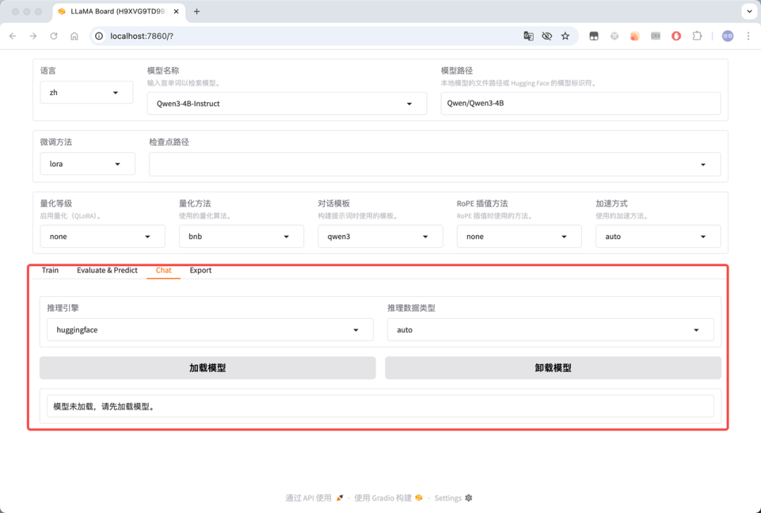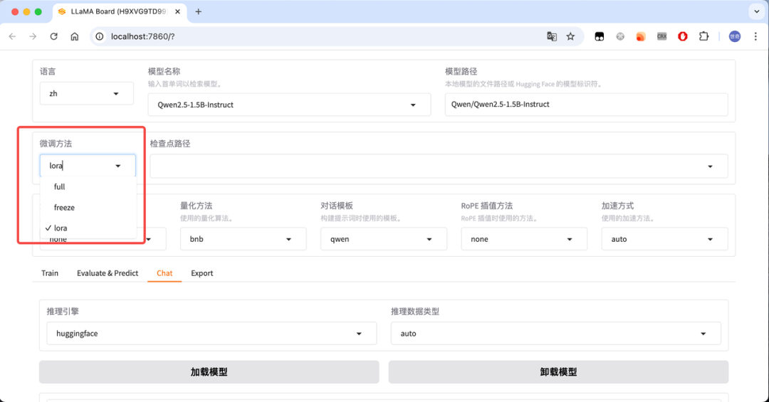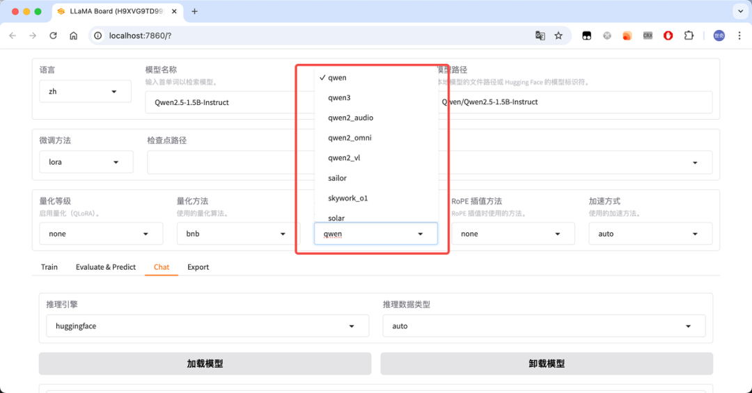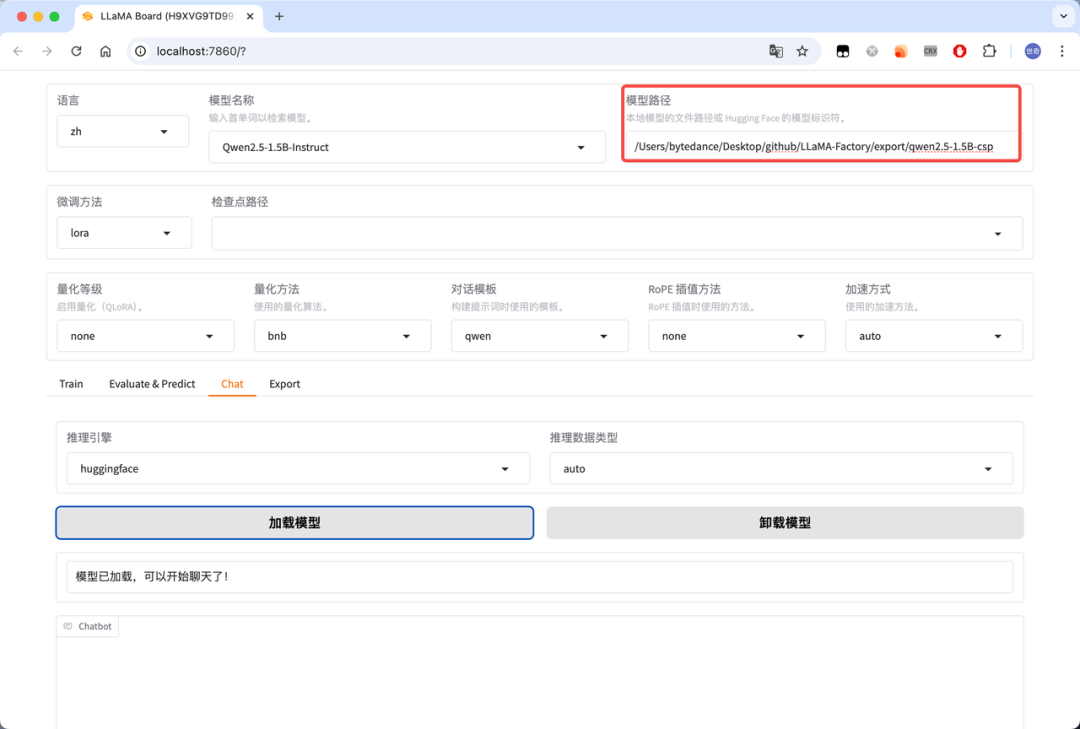 - 在线推理:可以选择使用 huggingface、vllm 等推理引擎和模型在线聊天,主要用来测试加载模型: