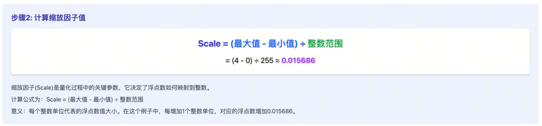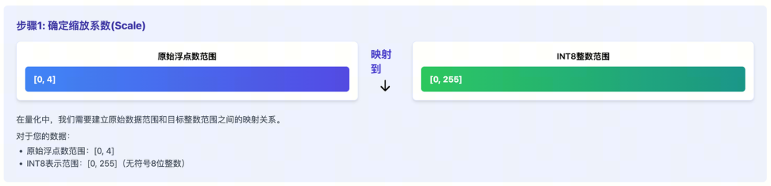 - 确定缩放系数:假设我们的数据范围是[0, 4],使用无符号 INT8(范围0~255),那么Scale = 4/255 ≈ 0.0157;