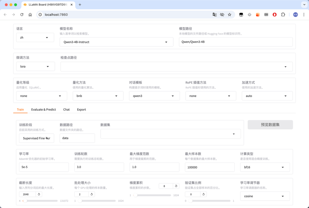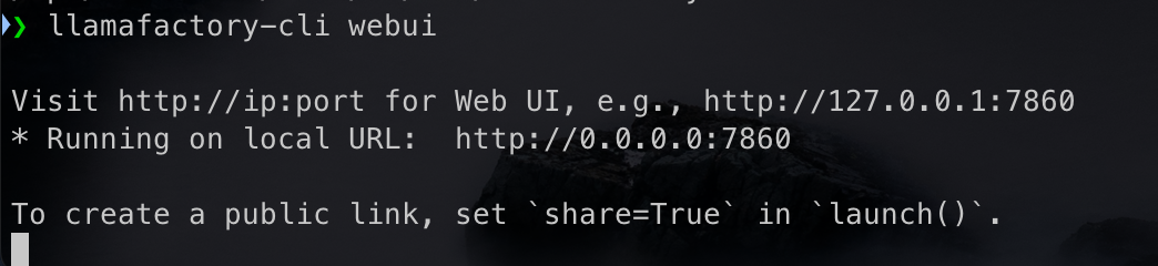 依赖安装完成后,我们执行:llamafactory-cli webui,可以启动 LLaMa Factory 的 webui:
