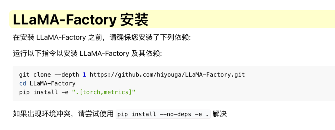 我们在官网可以看到 LLaMa Factory 的安装方法:https://llamafactory.readthedocs.io/zh-cn/latest/getting_started/installation.html#llama-factory