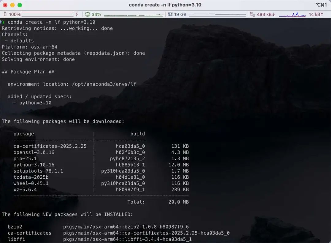 然后使用 conda create 命令创建一个新的虚拟环境。例如,创建一个名为 lf (LLaMA Factory 简称)的虚拟环境,并指定 Python 版本为 3.10: