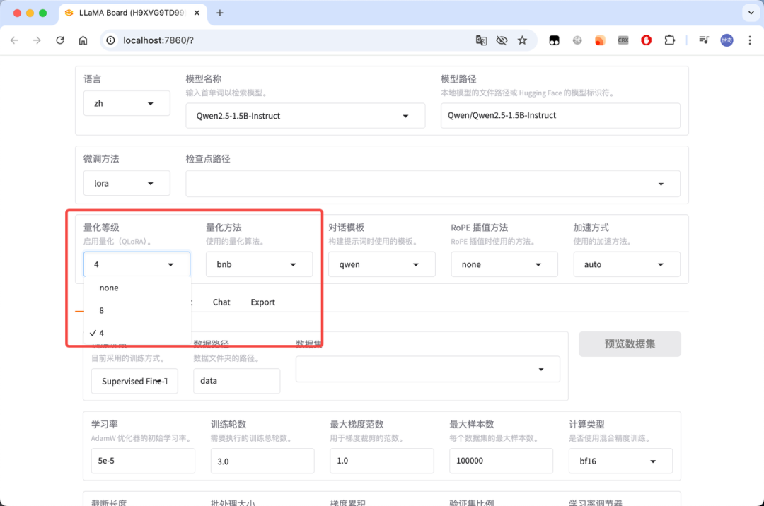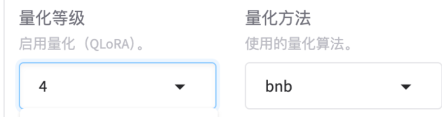 在模型微调中,量化也是一种很重要的加速手段。以 QLoRA 为例,它创新性地将4位量化与低秩适配器 LoRA 相结合,通过动态量化、双量化和训练时反量化机制,在大幅减少显存占用的同时,保障梯度更新的准确性。所以,在这里如果我们选择启动量化,并选择量化等级,默认使用的微调方法就是 QLoRA。