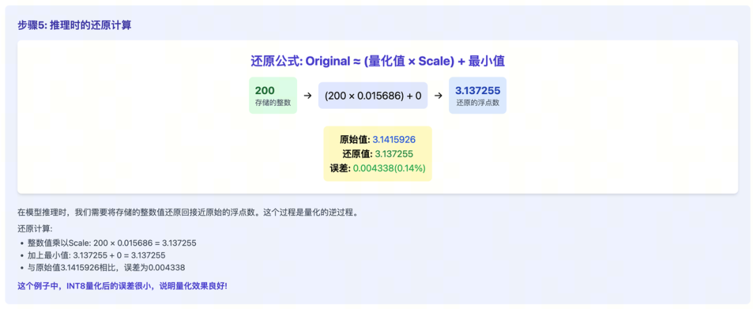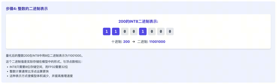 我们可以看到,上面的 INT8 存储的值是 11001000(转换为 10 进制为 200), 这里就会用到一个量化的过程: