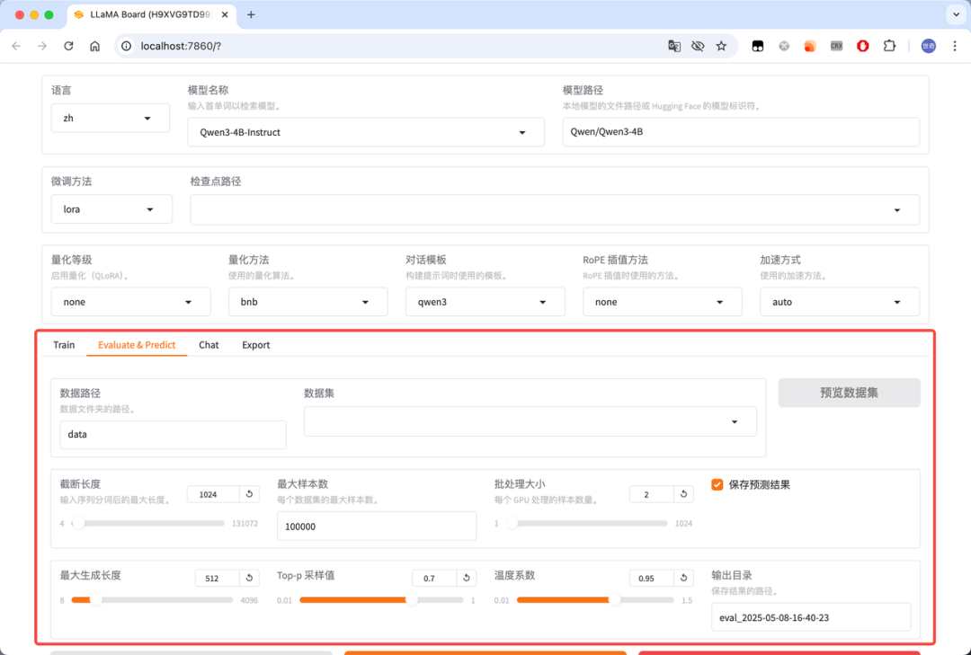 - 模型部署:支持将 LoRA 适配器与基座模型一键合并为独立完整模型,便于本地化部署;