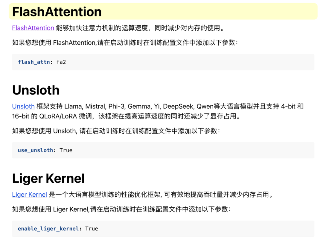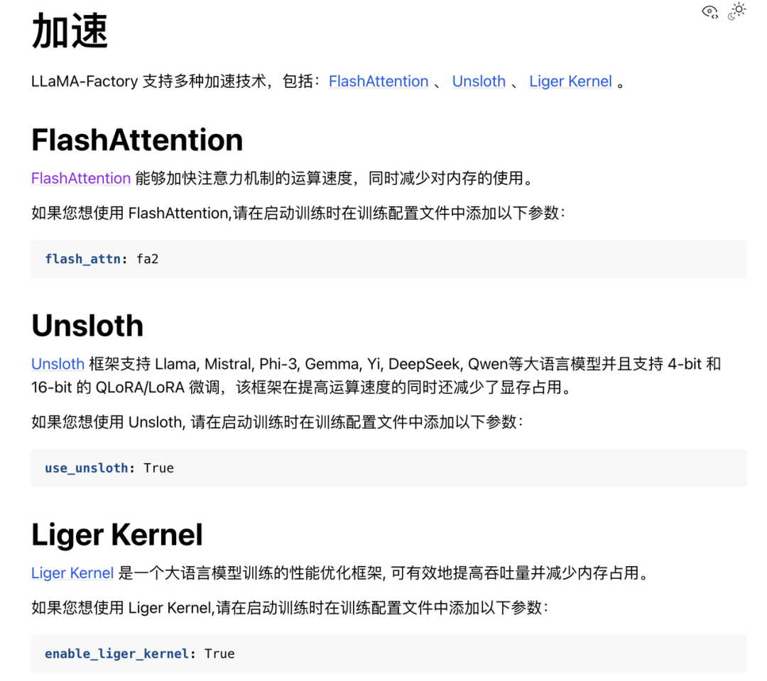 我们可以在 LLaMa Factory 文档(https://llamafactory.readthedocs.io/zh-cn/latest/advanced/acceleration.html)看到,unsloth 作为一种加速手段出现在了 LLaMa Factory 的介绍里。