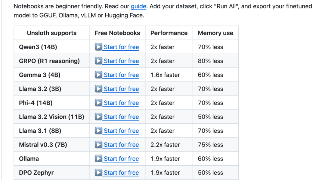 从以上描述中我们可以看出,Unsloth 主要突出的是更快的速度和更小的内存占用,并且在 Github 上公开了很多整理好的 Colab 笔记本: