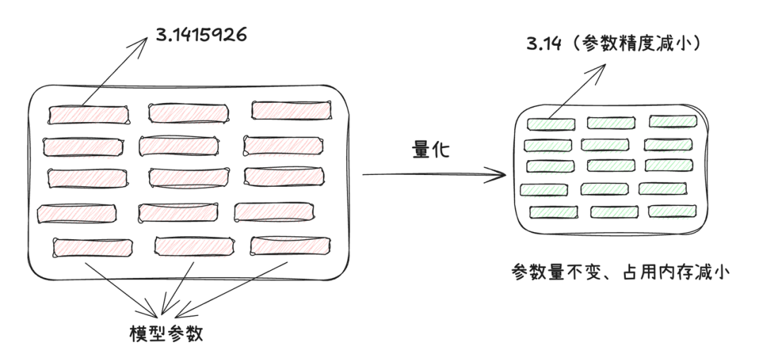 模型量化是一种通过降低权重和激活值的精度来减小模型尺寸、加快推理速度,同时尽量保持模型准确率的技术。简单来说,就是用更少的数字位数来表示模型中的数据。
