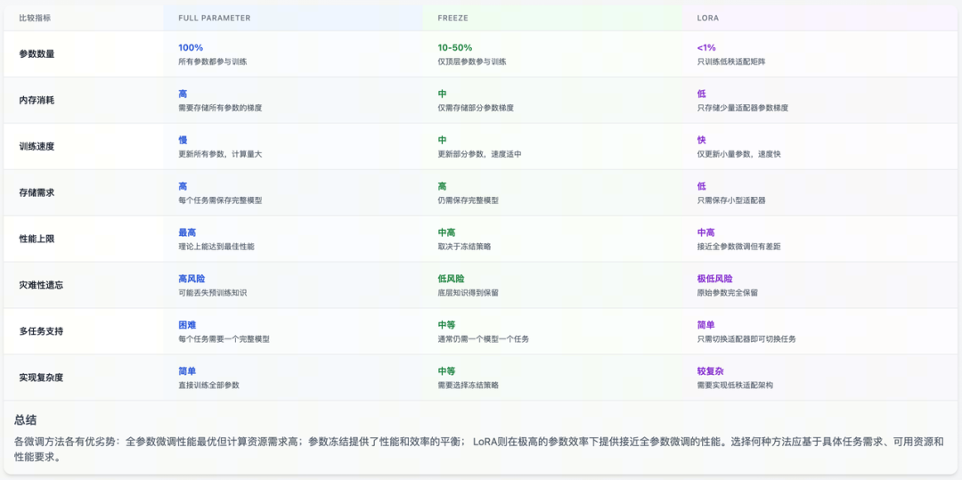 - 性能上限:在某些复杂任务上可能弱于全参数微调