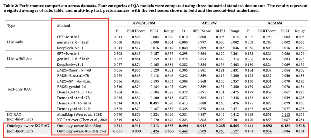 Ontology-aware KG-RAG 总体获得最优,对比模型:DeepSeek-v3.1 、gemini-2.0-flash、Dense+gemini-2.0、BM25+Qwen1.5-14B