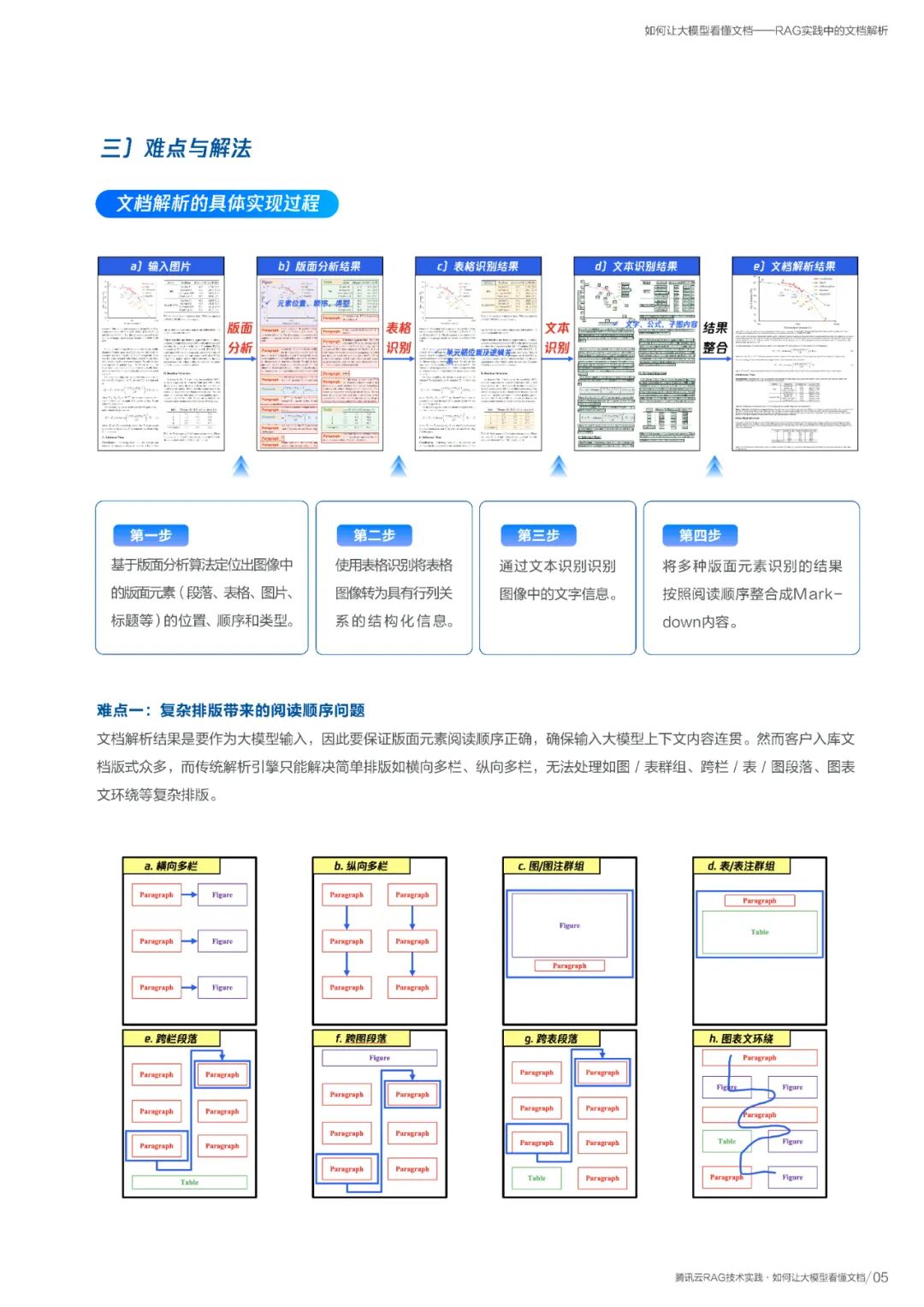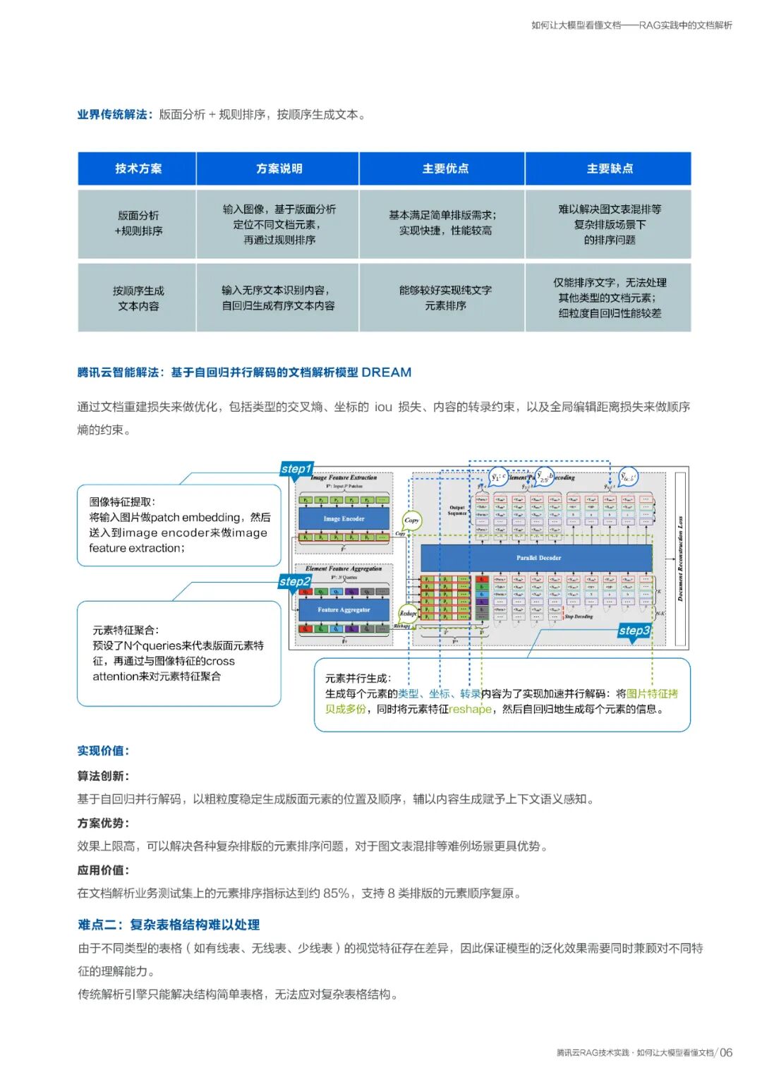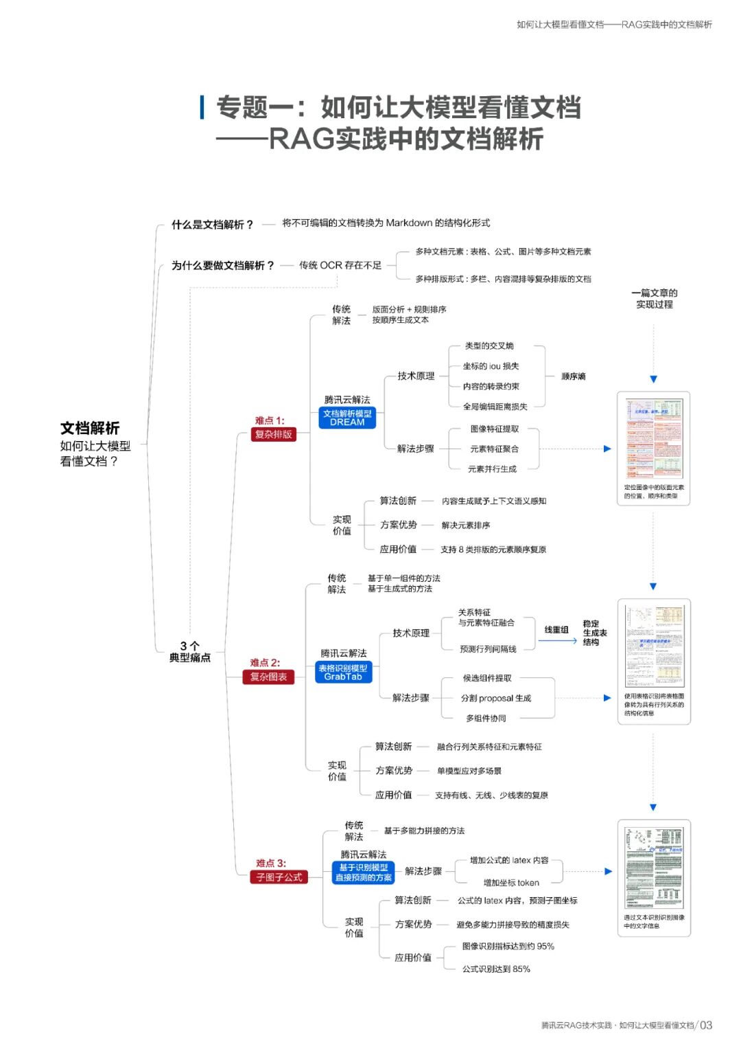 报告深入探讨了RAG实践的首要难题——文档解析。针对大模型难以“看懂”复杂排版、图表和公式的问题,报告给出了腾讯云DREAM、GrabTab等模型的解决方案。