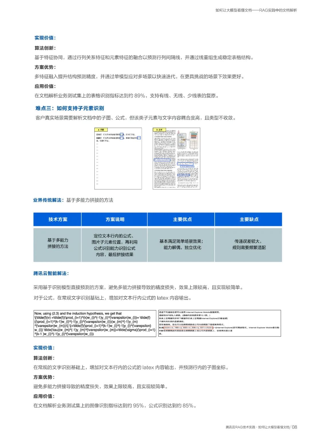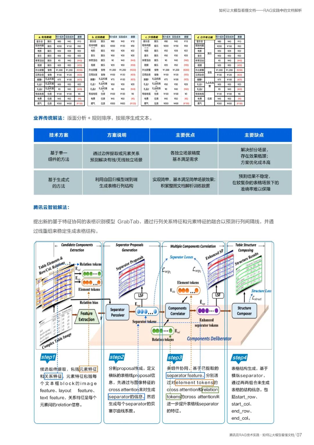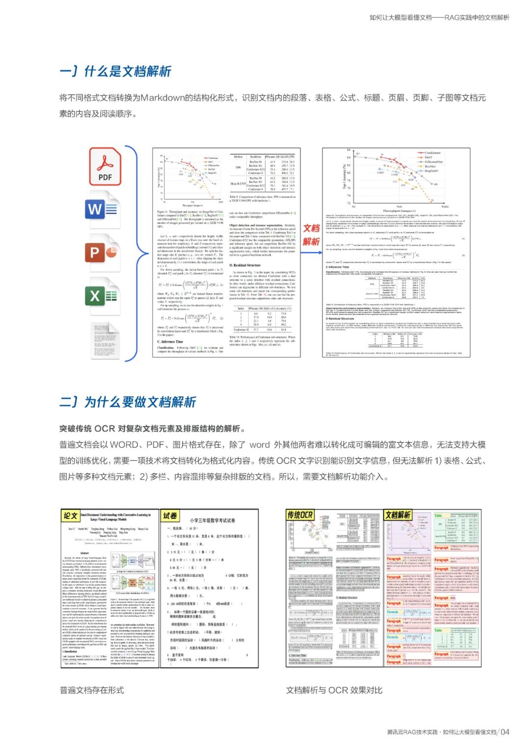 报告深入探讨了RAG实践的首要难题——文档解析。针对大模型难以“看懂”复杂排版、图表和公式的问题,报告给出了腾讯云DREAM、GrabTab等模型的解决方案。