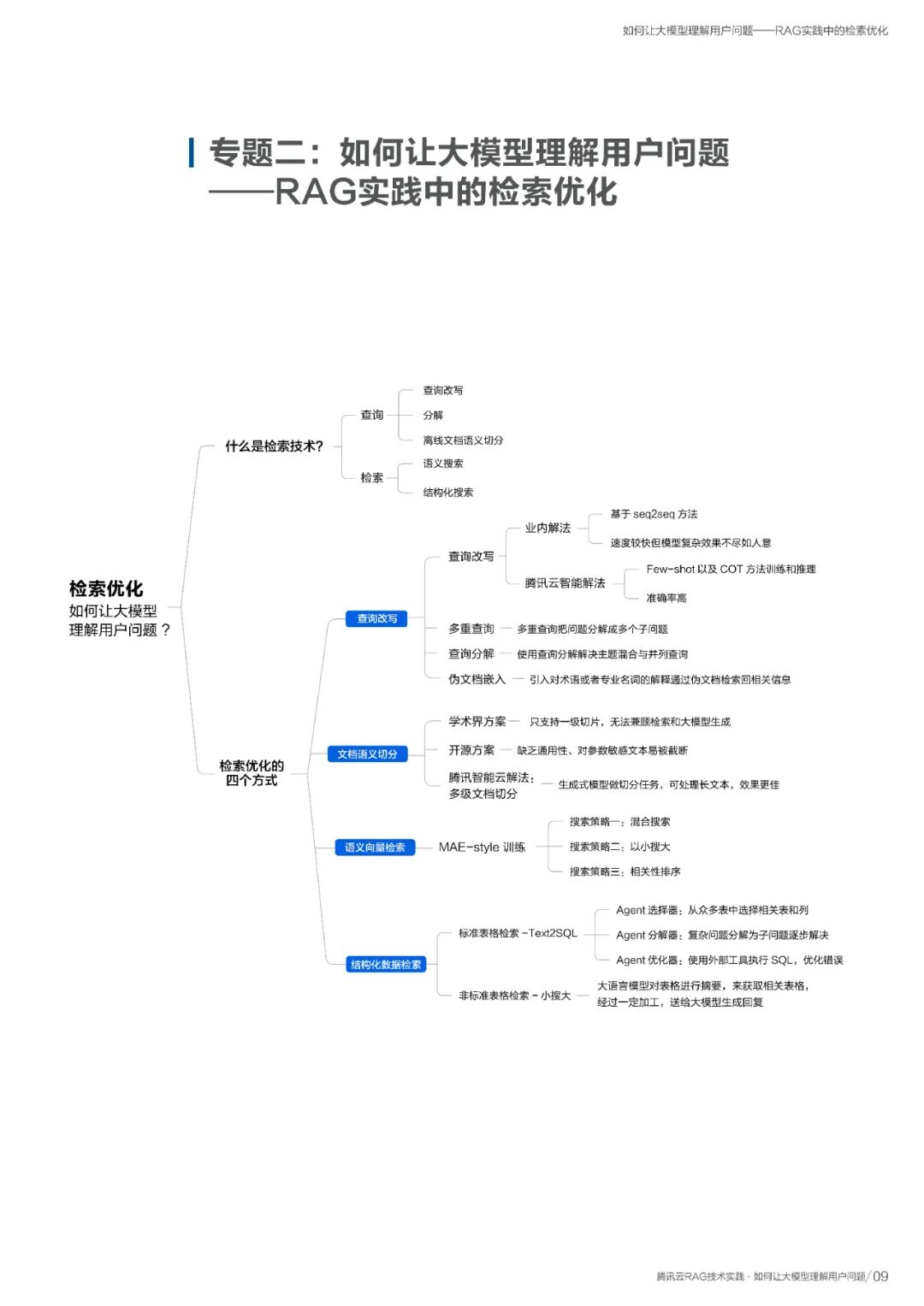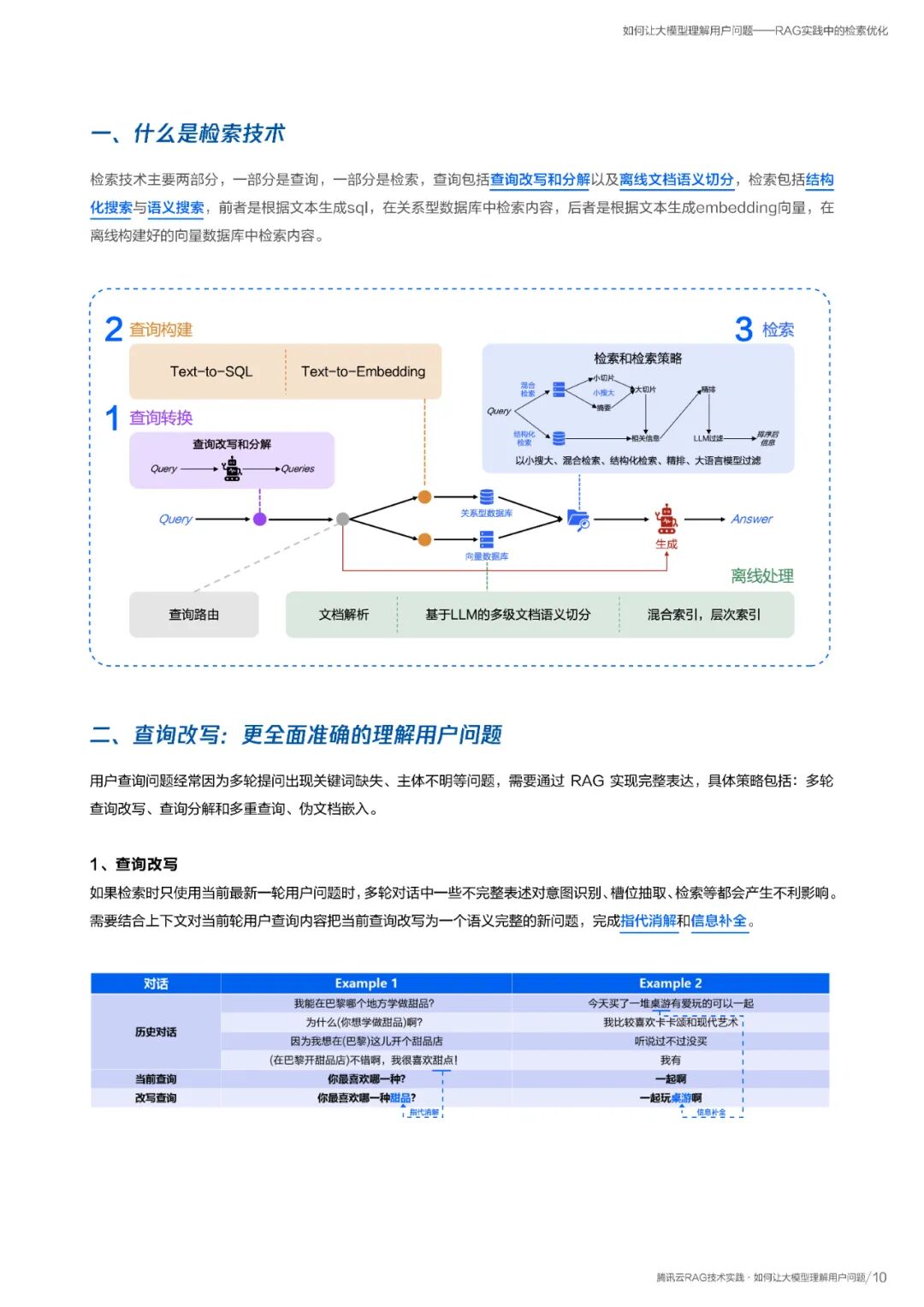 其次,报告聚焦检索优化,阐述如何通过查询改写、多级文档切分和结构化数据检索 等方式,帮助大模型精准理解用户意图。