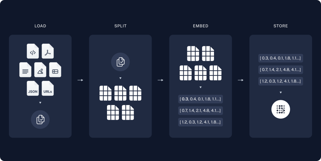 - 存储(Store):通过嵌入模型将切分后的文本块转成嵌入向量存入向量数据库。