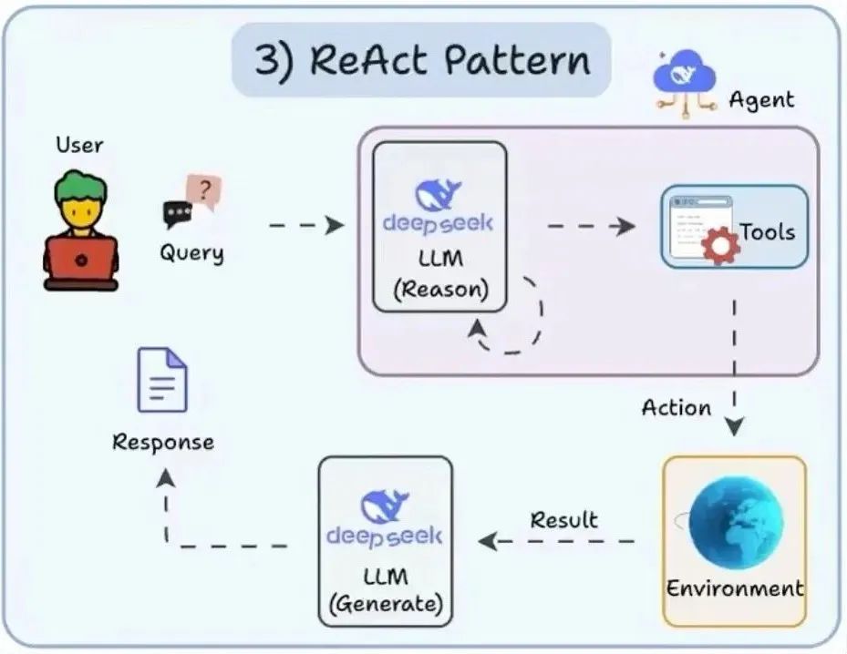 Agent结合推理和行动能力,先对用户查询进行推理分析,确定需要采取的行动,执行行动获取结果,最后基于结果生成响应。
