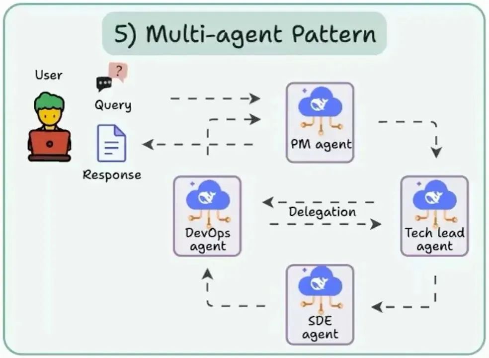 多个专业agent协同工作,通常由一个项目管理型agent接收用户查询并协调任务分配,各专业agent(如开发、技术负责人等)负责处理特定领域的问题。