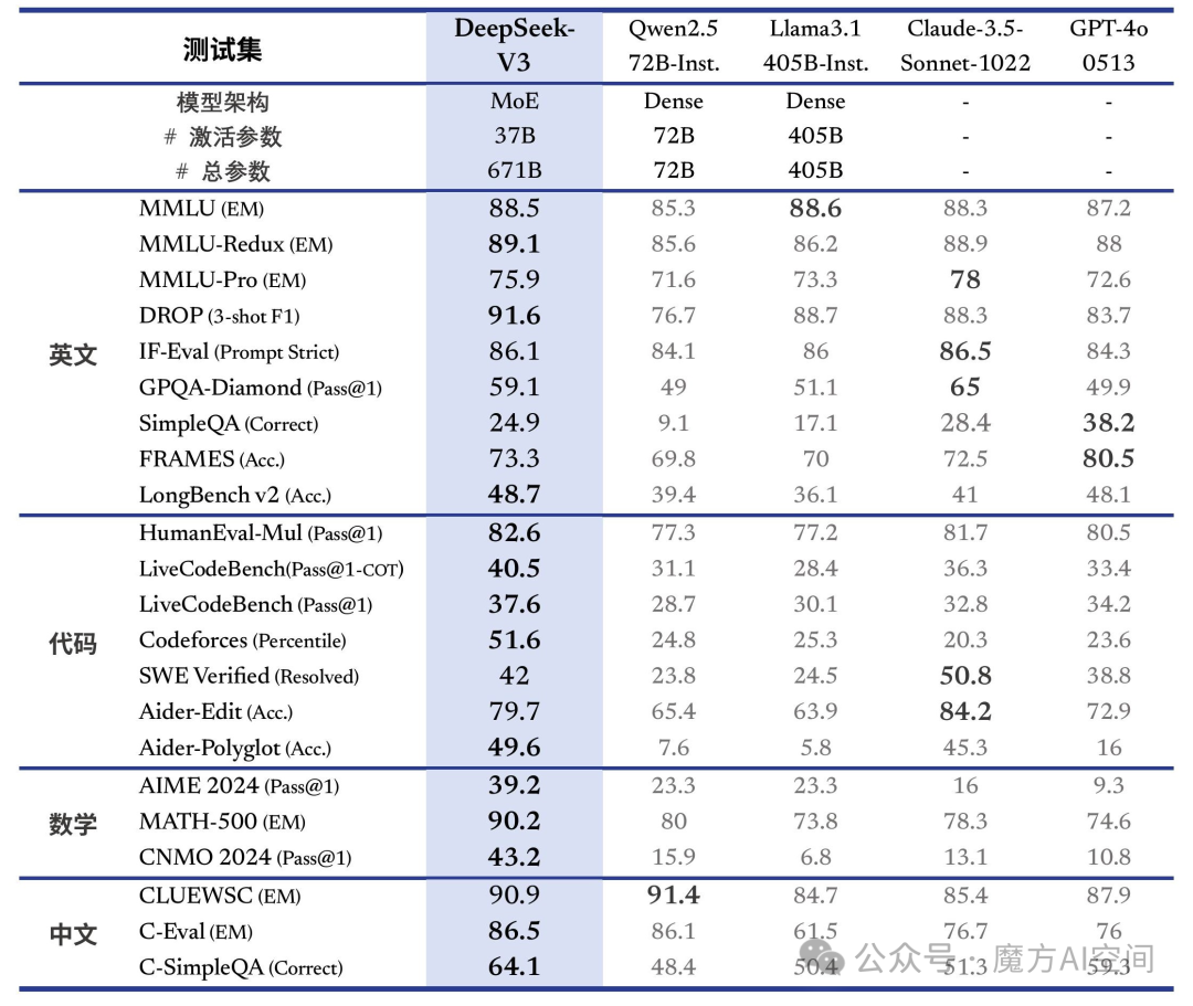DeepSeek-V3 多项评测成绩超越了 Qwen2.5-72B 和 Llama-3.1-405B 等其他开源模型,并在性能上和世界顶尖的闭源模型 GPT-4o 以及 Claude-3.5-Sonnet 不分伯仲。