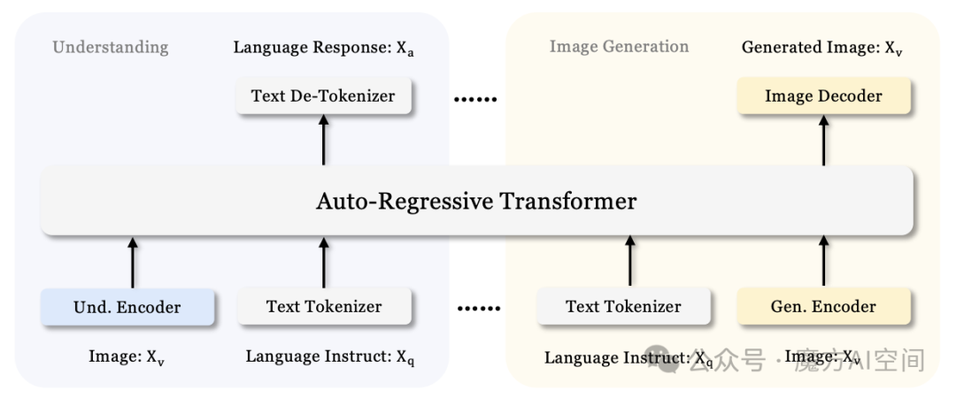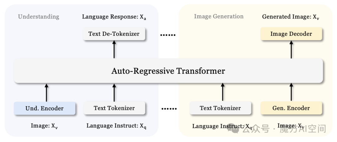 图3 | Janus-Pro架构。将多模态理解的视觉编码与视觉生成解耦。“Und. Encoder”和“Gen. Encoder”分别代表“理解编码器”和“生成编码器”。